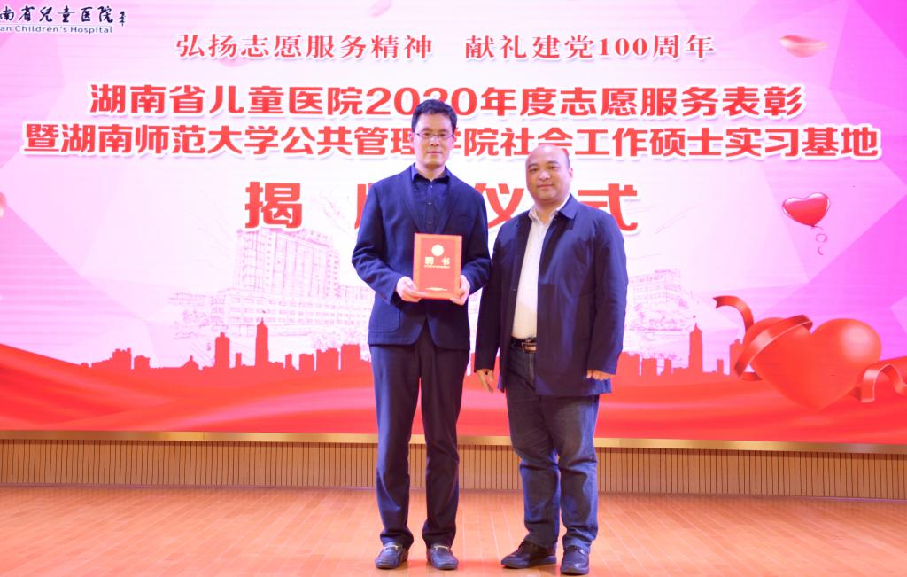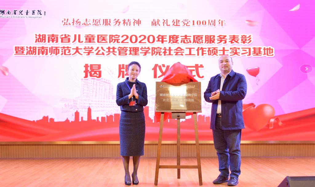 2021年4月2日下午,bet36365路检测中心与湖南省儿童医院在其新外科大楼26楼大礼堂隆重举行社会工作硕士实习基地揭牌仪式,在揭牌仪式前湖南省儿童医院还对其2020年度志愿服务先进单位和个人进行了表彰。揭牌仪式由省儿童医院社工部主任王幸主持,省儿童医院党委书记谭李红、工会主席王可为参加仪式。bet36365路检测中心副院长李超民、社会工作硕士教育中心主任孙建娥、社会学系冯元博士及部分2020级社会工作硕士研究生和2019级社会学本科生等参加了此次活动。