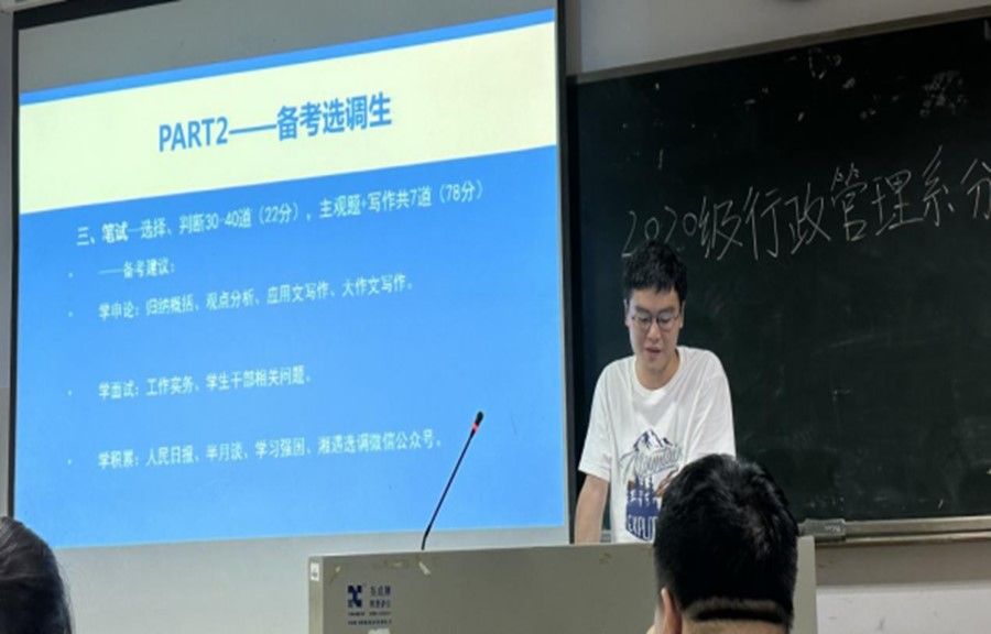 此次分享交流会在2020级行政管理班班长叶全的主持下召开。会议开始,他介绍了参与此次分享交流会的所有老师和学长学姐。在一片热烈的掌声中,首先请到了曹文浩学长为大家分享有关保研的经验。在曹文浩的分享中,他对夏令营的报名、以及保研的复试复习方法进行了分享。随后,胡立敏从多个方面给大家分享了考研的复习准备方法与自我心态调节,并给大家推荐了考研好物必备。接着,胡文江推荐了一些考研政治学的书籍并分享了自己的一些复习方法。然后,李瑞成给大家分享了国考、省考的相关经验和复习方法,从思想准备和方法方式等方面给出了大家建议。最后,杨尚文给大家具体介绍了选调生是什么,并对考选调生的必备条件、选岗以及风险进行了详细分析。