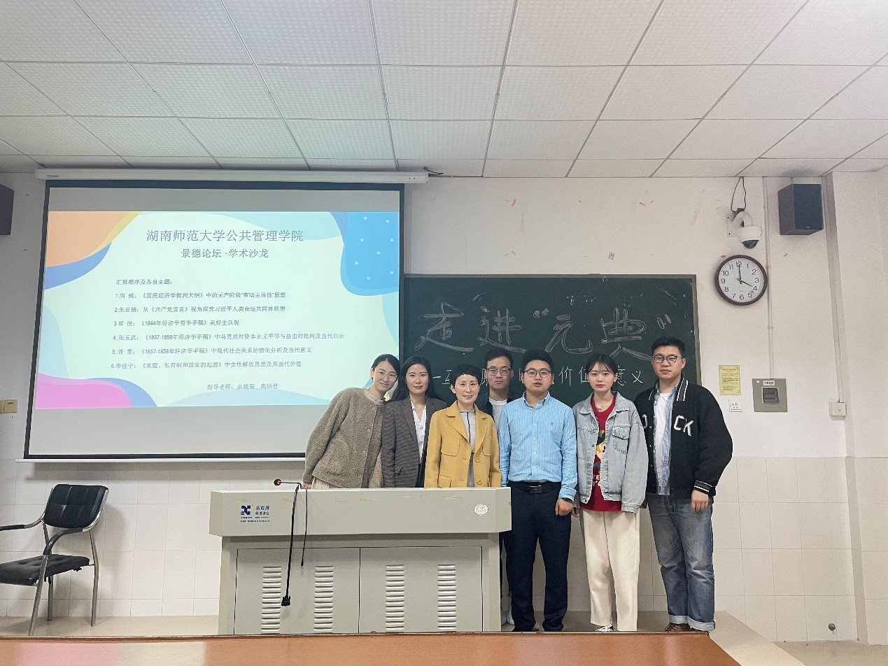 第15期“景德论坛·学术沙龙”活动以“走进‘元典’——马恩作品的时代价值与意义”为主题,来自哲学专业的朱亚楠、向威、李佳宁、张玉武、胥雯和郑俊六位同学为本次活动的主讲人,并邀请了哲学系余晓菊、高绍君老师前来指导。六位主讲人分别品读了《国民经济学批判大纲》、《共产党宣言》、《1857-1858经济学手稿》、《1844年经济学哲学手稿》、《家庭、私有制和国家的起源》等经典。余晓菊老师呼吁同学们:“走进‘元典’,服务社会。”鼓励同学们从思考如何解读、解读什么、解读的意义三个方面“走进‘元典’”,服务于意识形态的同时立足于哲学思辨本身,解读“元典”的初心,树立问题意识。高绍君老师指出,不能感官地以直接现实经验表述问题,要深入全面地解读“元典”,哲学地讨论问题,立足文本,论述哲学原著的当代价值。