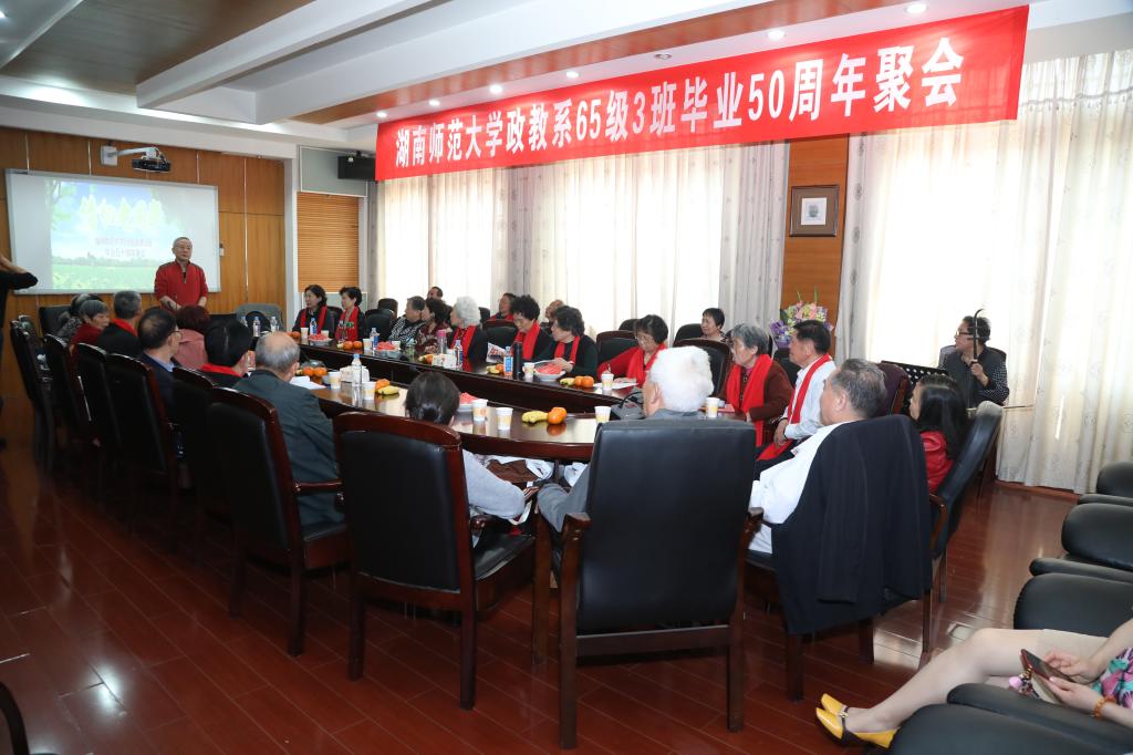 下午2:30在学院415会议室,65级3班的校友们围坐一起,举行了由班长李屏南主持的毕业50周年座谈会。座谈之始校友们认真观看了湖南师范大学建校80周年宣传片《师道初心》。八十载弦歌颂雅,新时代风华赓续,他们为母校取得的成就感到与有荣焉,期盼学校站在新的历史起点上,再创新辉煌。接着,校友们结合个人工作经历依次发言,或谈人生感悟,或谈求学趣事、或谈家庭琐碎,多年前的往事仿佛就在昨天,烙印心田。年届七十的校友们,携着五十余载友谊岁月的印痕,望着昔日同学,时而亲昵地对话谈笑,时而激动地握手、拍肩,互动不断。最后,有校友拉起二胡,带来《赛马》、《翻身道情》等经典曲目,有校友吟诗抒怀,场面温馨热闹,座谈会在欢声笑语声中结束。