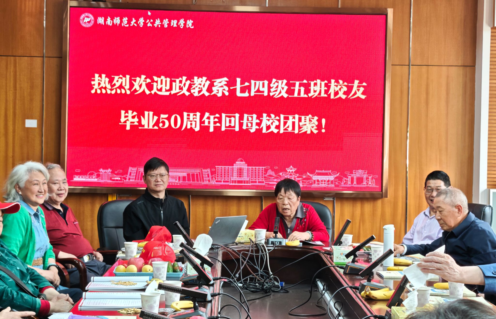 4月14日上午,36365线路检测中心在景德楼中栋415会议室召开湖南师范大学政教系七四级五班校友毕业五十周年返校团聚活动。学院党委书记余望成、院长毛新志、党委副书记孙雯波等领导热情接待,与校友们共叙情谊、畅谈发展。与会校友集体参观师大校园新貌,感悟母校深厚的历史积淀和文化底蕴,并拍照留念。