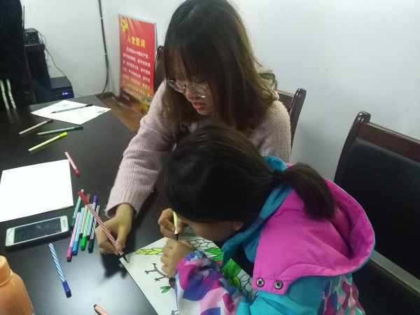 早晨,志愿者们早早地来到活动地点,迎接参加此次活动的小朋友。待所有小朋友到来之后,此次活动正式开始。志愿者们带领小朋友们一起绘画。在绘画完成后,小朋友们带着各自的画作上台分享、展示他们的创意,然后进行现场投票,通过各画作最终票数,选出了一副最佳作品,由志愿者给最佳作品的作者颁发奖品。下午是课程辅导课,志愿者们耐心地为小朋友们解答疑难问题。为了让小朋友们劳逸结合之后,志愿者又陪着小朋友们一起玩了乒乓球、飞行棋等游戏。活动接近尾声,确保小朋友们都有被家长接走后,志愿者们踏上了归程。