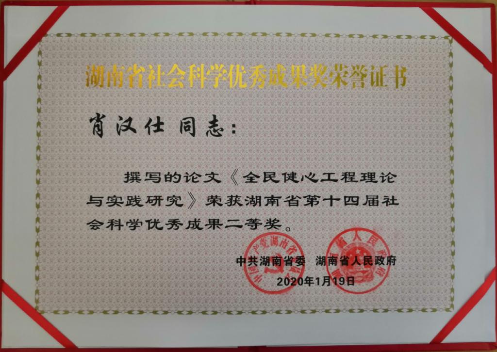 36365线路检测中心博士生导师、社会治理与社会政策研究所所长、中国全民健心网首席专家、健心学堂创建者、心理学二级教授肖汉仕的“全民健心工程理论与实践研究”荣获中共湖南省委、湖南省人民政府颁发的湖南省社会科学优秀成果二等奖。
