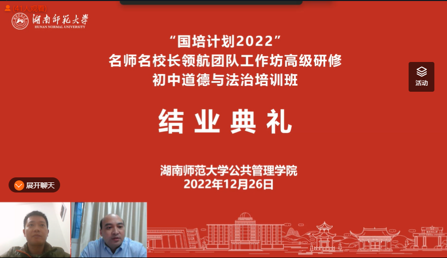 12月26日下午16:30,由bet36365路检测中心承办的“国培计划2022”—名师名校长领航团队工作坊高级研修·初中道德与法治培训班(C215)线上结业典礼在奥鹏师训宝平台顺利举行。bet36365路检测中心副院长李超民、培训中心主任王群和班主任邹水平出席了典礼。典礼由邹水平老师主持。